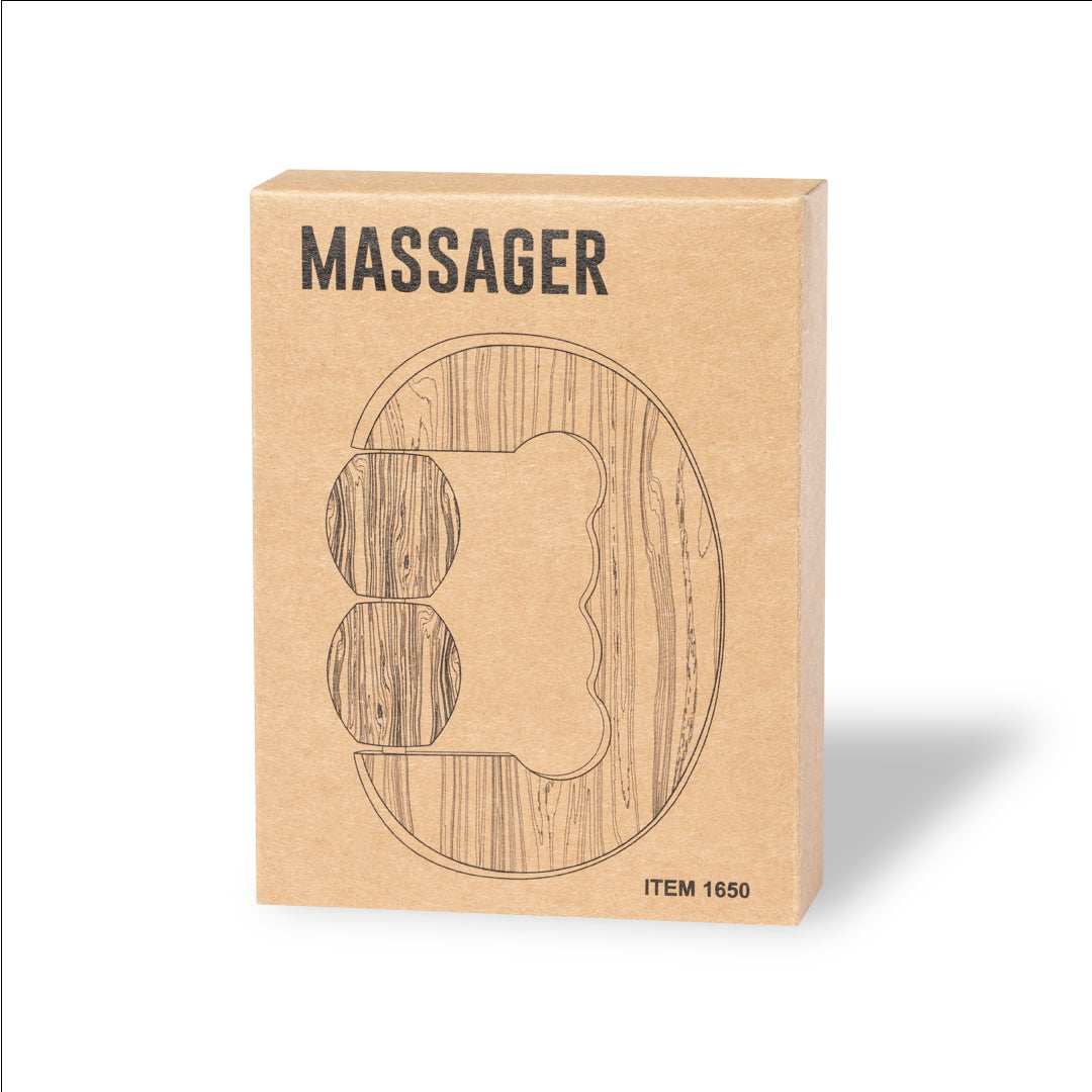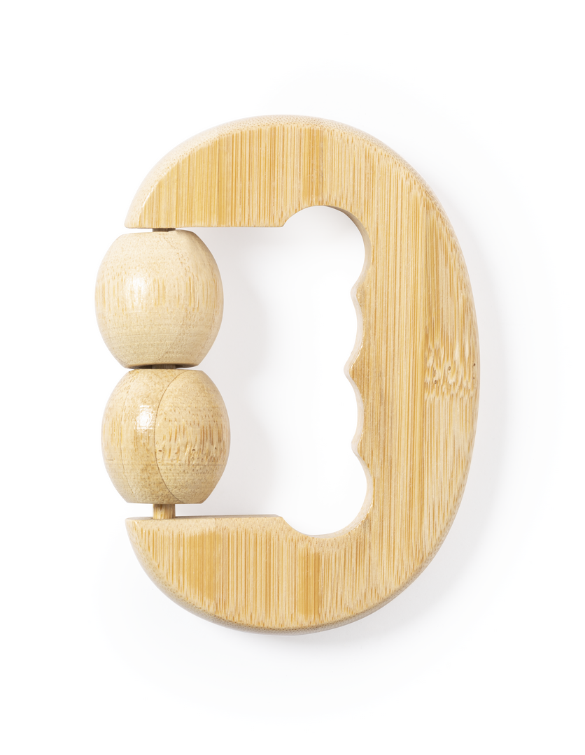 Masajeador de línea nature, fabricado en en bambú. Con 2 bolitas masajeadoras a juego y asa ergonomica. Presentación en caja individual de diseño kraft.