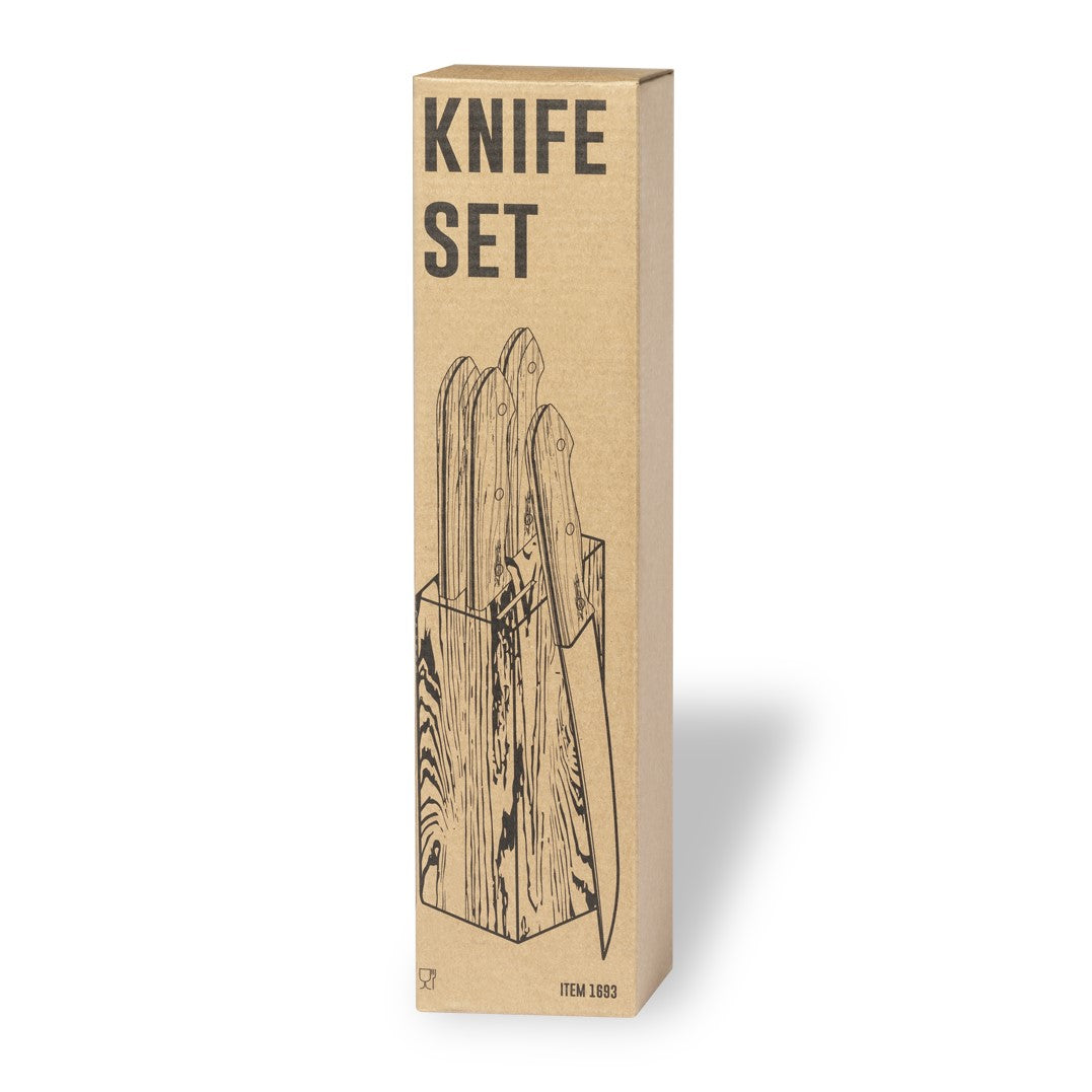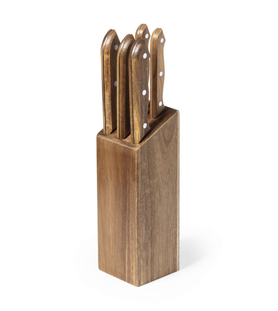 Completo tacoma con base fabricada en resistente madera natural de acacia. Incluye 5 cuchillos en distintos tamaños y para distintos usos, fabricados en acero inox, con mango en madera de acacia. Presentación en caja individual de diseño kraft