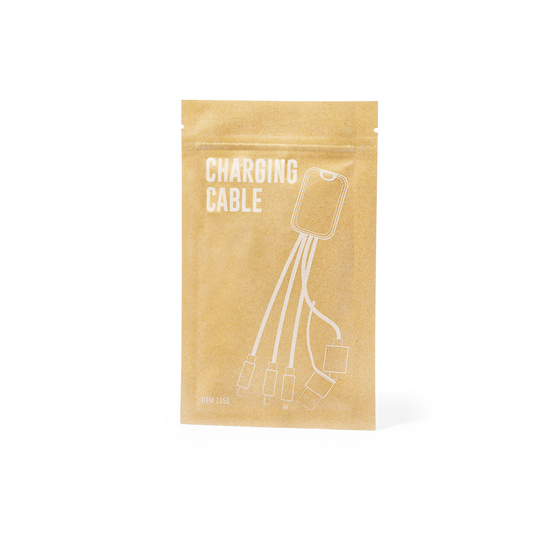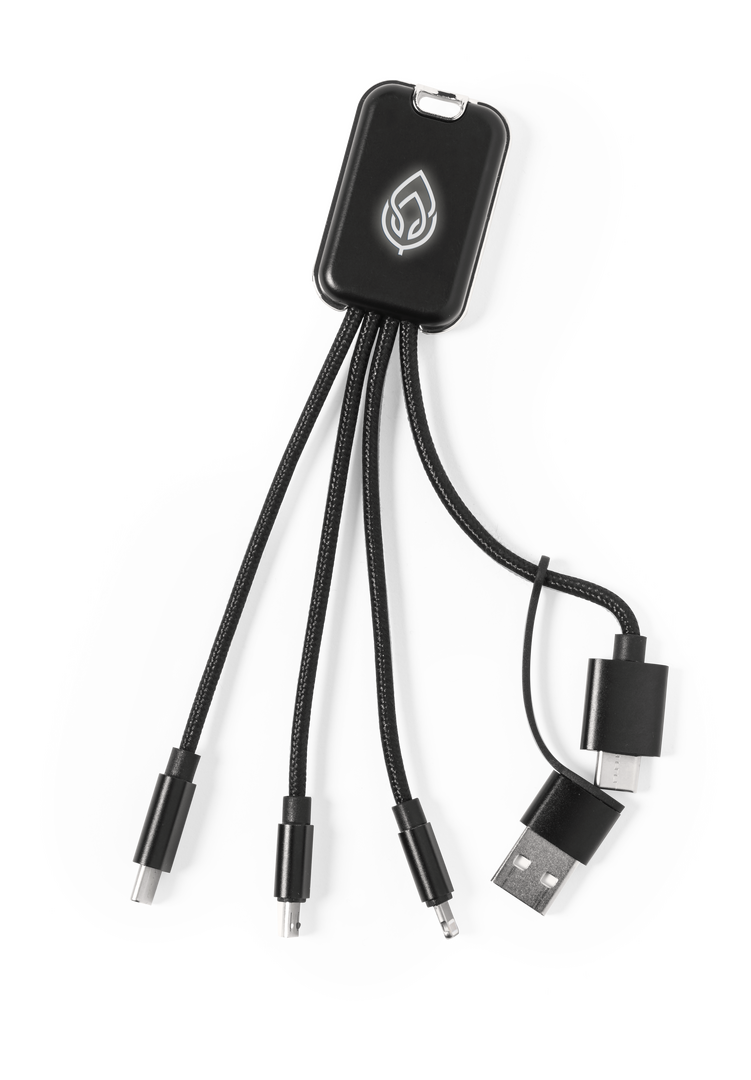 Cable cargador con luz, con pieza central especialmente diseñada para marcaje en láser e iluminar el logotipo. Con conexiones de entrada Tipo C y USB y salidas Tipo C, Lightning y Micro USB. 5V DC 2.4A. En elegante acabado de color negro, con cables recubiertos en tela de poliéster.