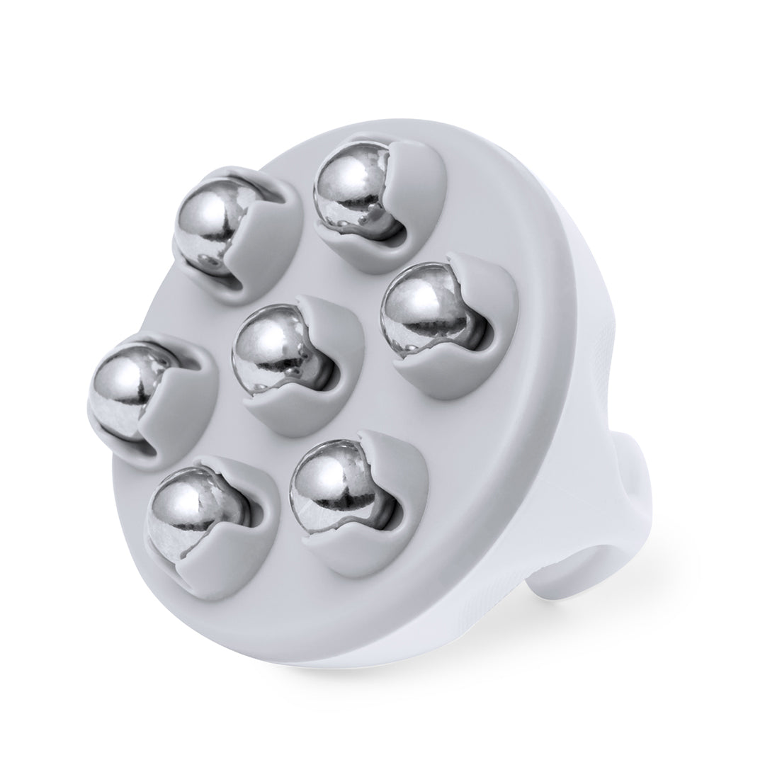 Masajeador fabricado en resistente ABS con bolas metálicas. Diseñado para brindar alivio y bienestar. Su empuñadura ergonómica garantiza un manejo cómodo, mientras que sus esferas metálicas efecto frío ayudan a la absorción de cremas, relajando la piel cansada. Presentado en caja individual de diseño kraft.