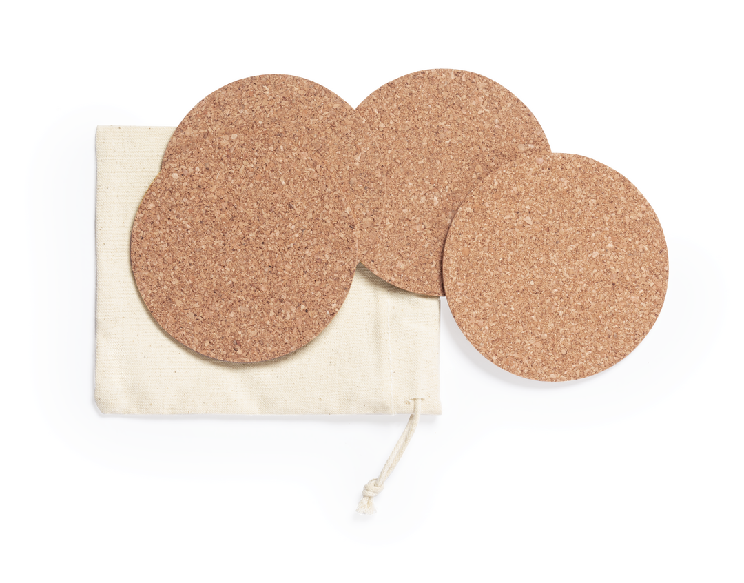 Set de 4 posavasos de línea nature, fabricados en corcho natural. Presentación en bolsa de algodón 100% con cierre de cordón.