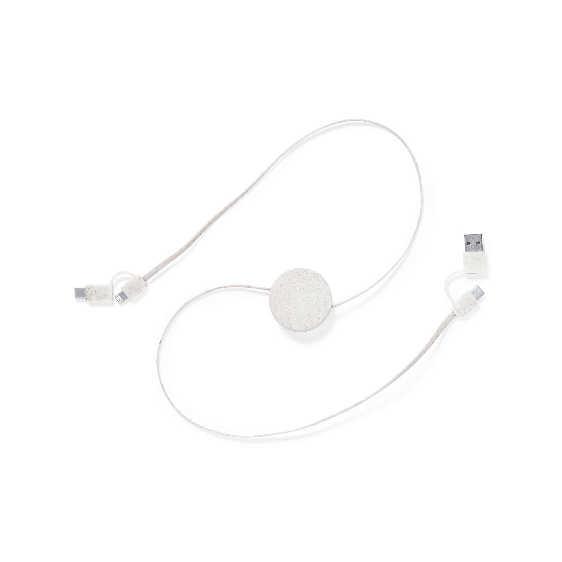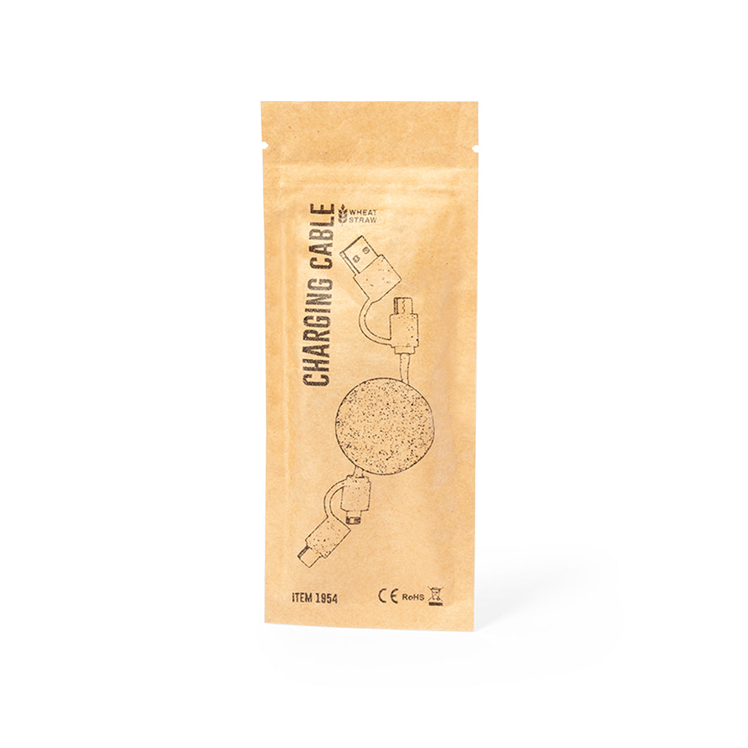 Cable cargador y sincronizador extensible, válido para cargar dispositivos y transferir datos. Fabricado en caña de trigo, para así fomentar la utilización de materias primas naturales y reducir las emisiones contaminantes. Pieza central con mecanismo interior extensible. Incluidas conexiones de entrada Tipo C y USB salidas Lightning, Micro USB y Tipo C. 5V DC 2.4A. Presentado en bolsa individual de diseño kraft.