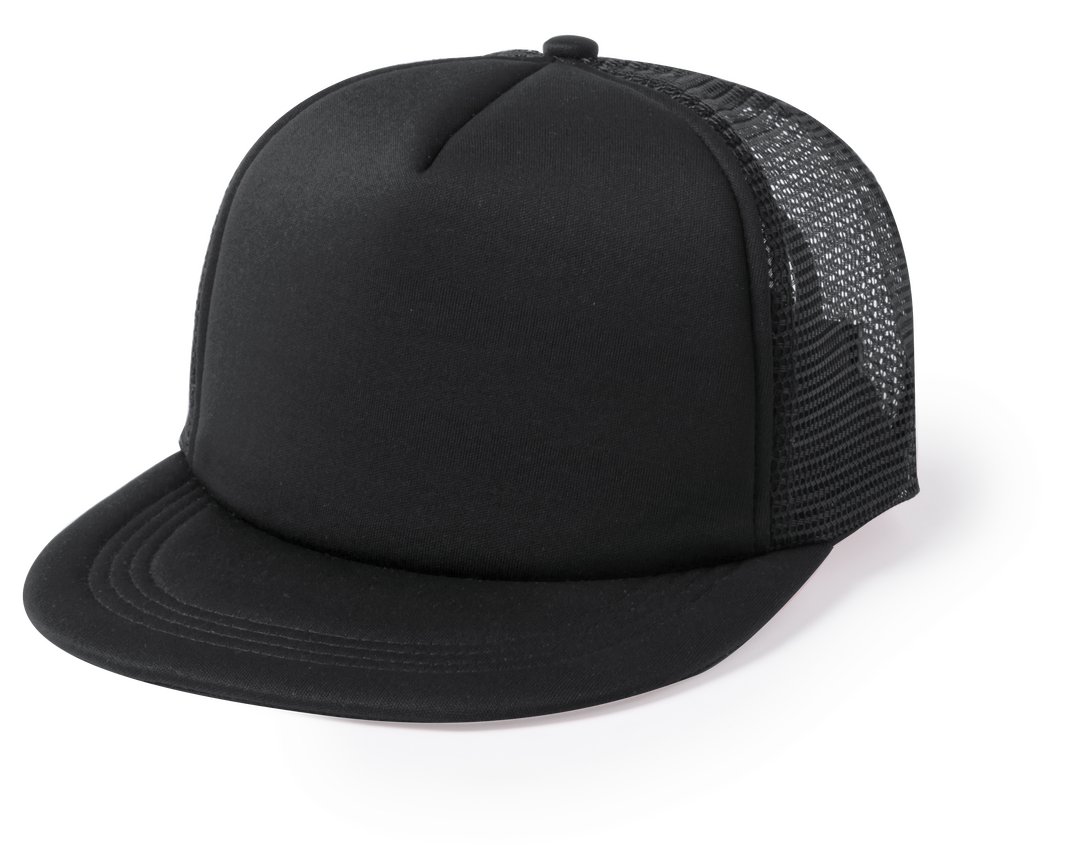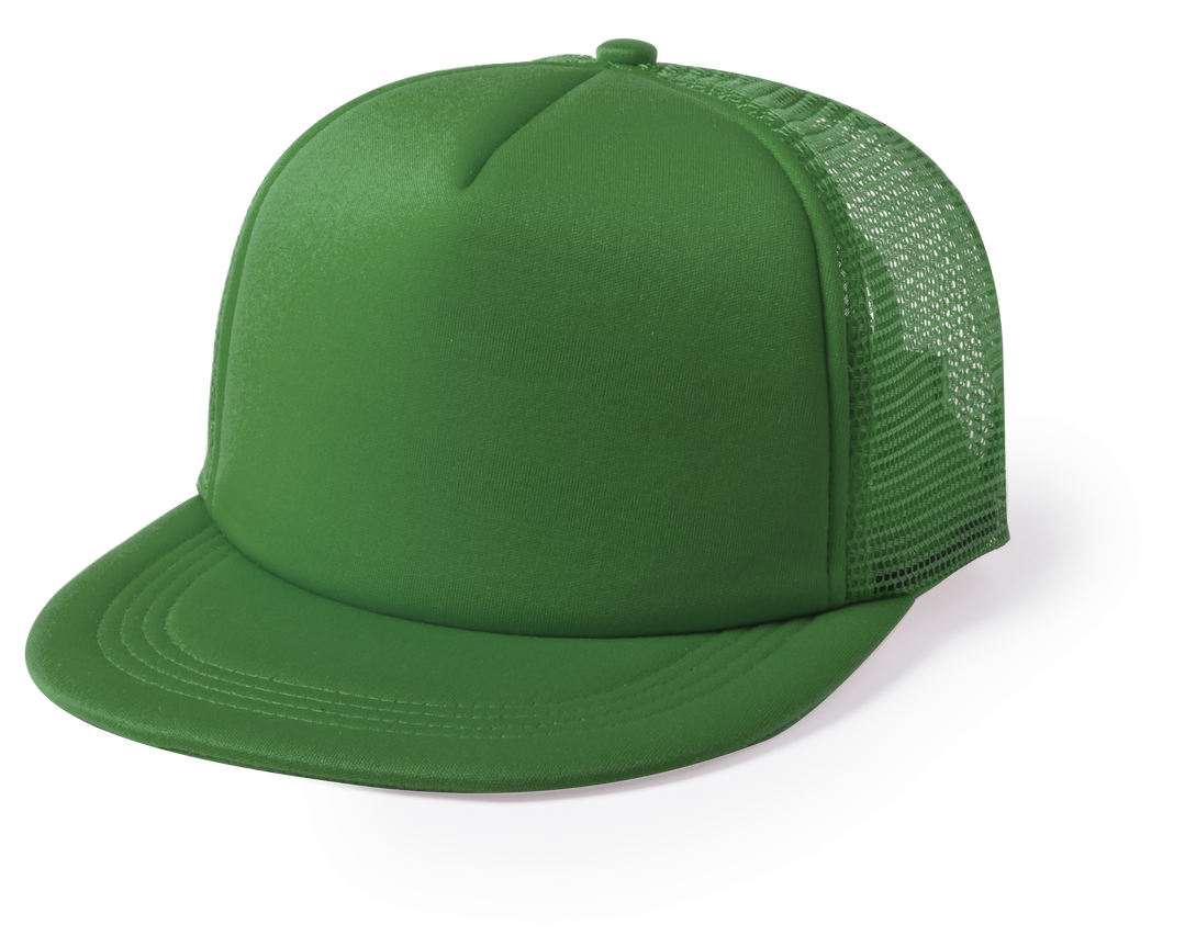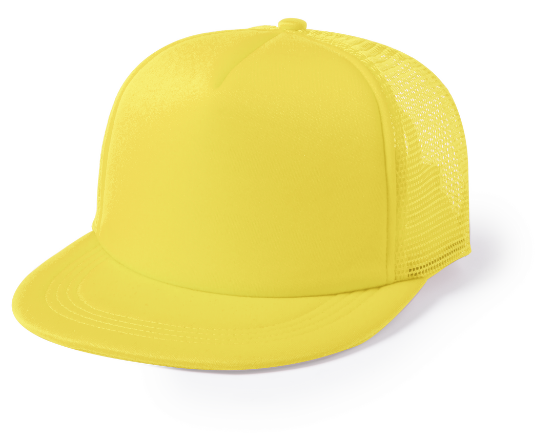 Gorra de 5 paneles con visera plana acolchada y parte trasera en redecilla a juego. Material 100% poliéster de suave acabado, con cierre ajustable de botones y en variada gama de vivos colores.