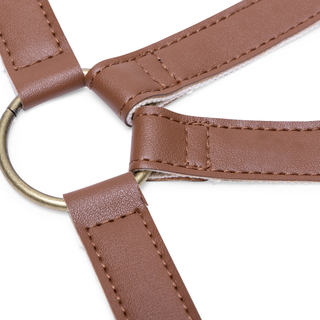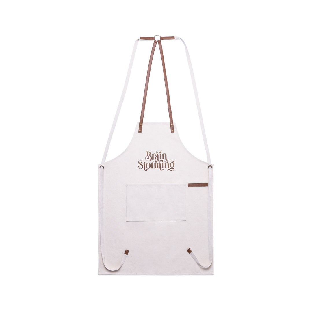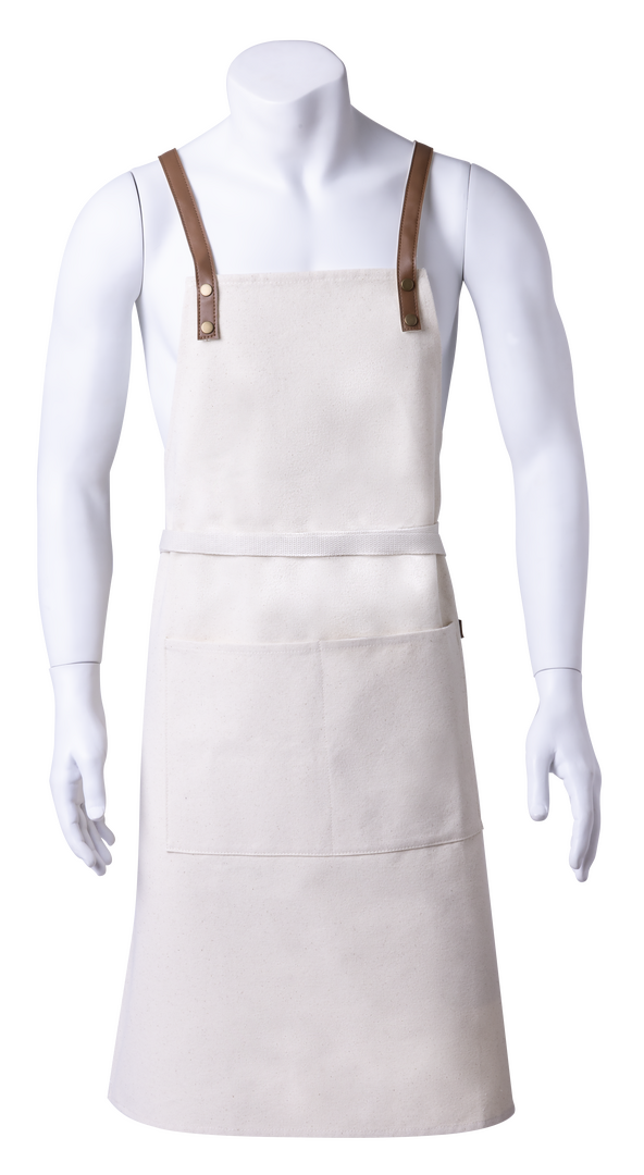 Delantal de alta calidad en resistente material 100% algodón canvas de 340g/m2, con costuras reforzadas. De corte por debajo de la rodilla, con cintas en resistente polipiel y triple ajuste: cuello, espalda y cintura. Con bolsillo frontal, accesorio en polipiel y remaches metálicos de refuerzo.