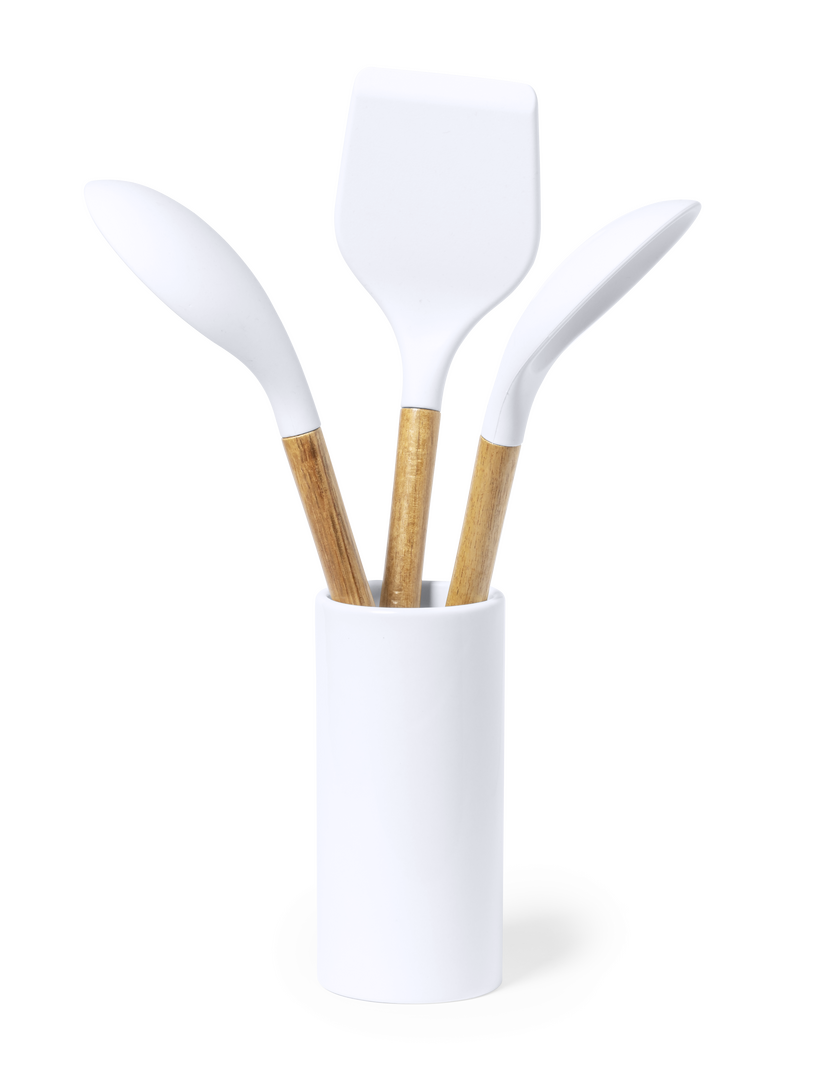 Set de cocina de 3 piezas, con mango fabricado en madera de acacia natural y accesorios en silicona. Incluye cuchara, paleta y espumadera, con base de cerámica a juego. Presentación en caja individual de diseño kraft.