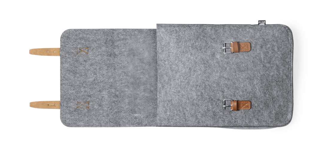 Mochila de diseño fabricada en resistente fieltro RPET, con tiras de cierre, asa de transporte y cintas para hombros en polipiel. Amplio compartimento principal, solapa con tiras ajustables y cierre de hebilla metálica. Con cintas para hombros ajustables y distintivo RPET en etiqueta exterior.El fieltro RPET es fruto de la combinación del proceso de reciclaje de materiales plásticos junto con la técnica milenaria de fabricación del fieltro, dando como resultado un material de eco-tendencia que, además de ser de origen reciclado, también se convierte en reciclable.