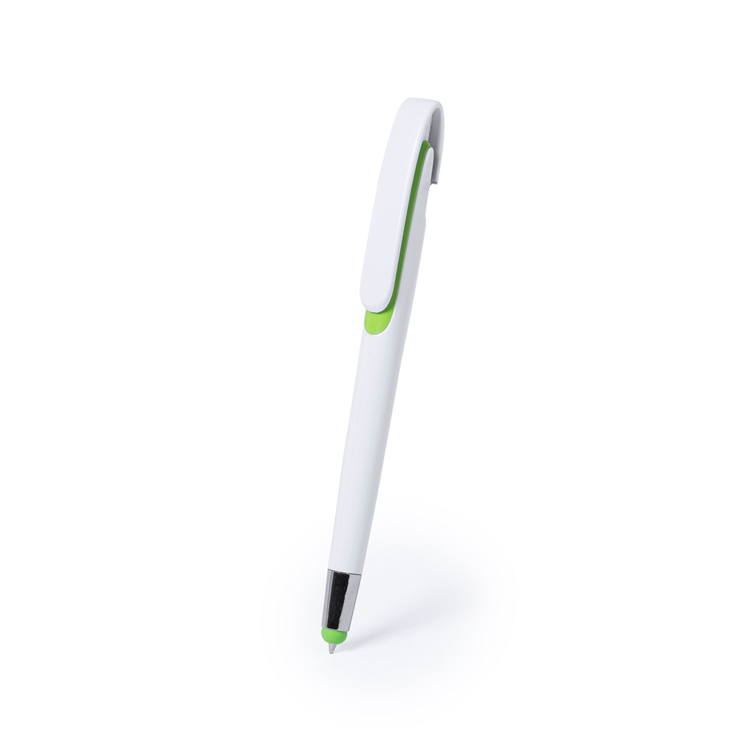 Bolígrafo puntero de mecanismo pulsador con cuerpo de acabado brillante en color blanco y accesorios en variada gama de vivos colores. Con clip maxi y tinta azul.
