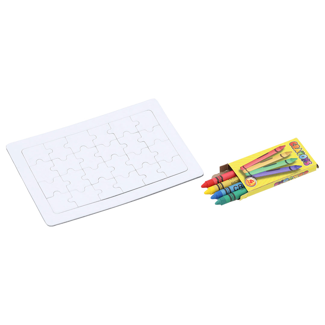 Divertido puzzle de 24 piezas en color blanco. Con caja de 4 ceras en colores amarillo, verde, azul y rojo incluida.