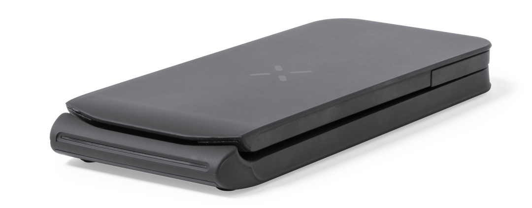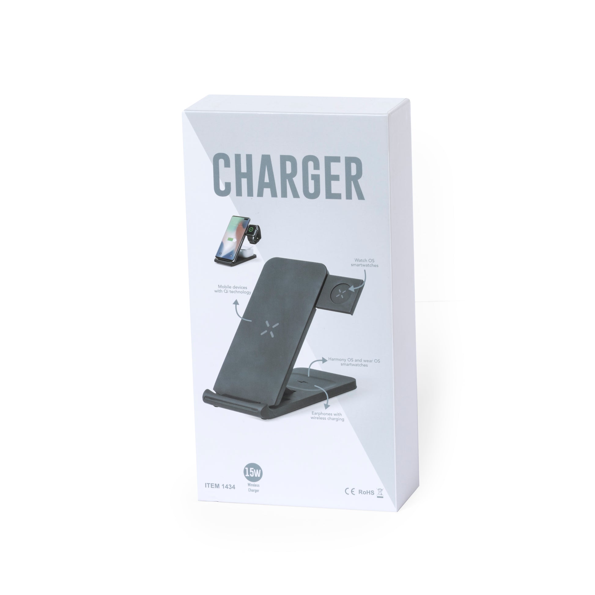 Completo cargador inalámbrico 15W con soporte para gadgets. Diseñado para la carga simultánea del smartphone, auriculares y smartwatch: una estación de carga todo en uno, versátil y plegable. Presentado en atractiva caja individual de diseño.