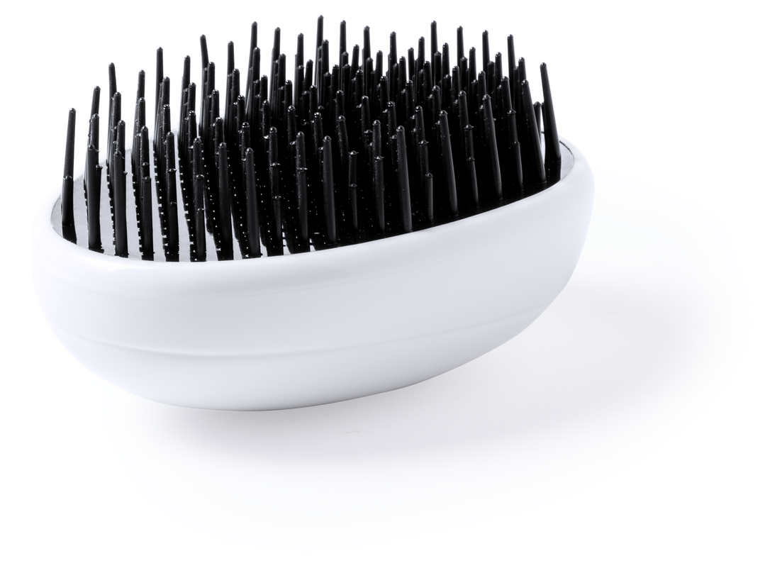 Cepillo de diseño minimalista con sistema antienredo y púas de diferentes longitudes.