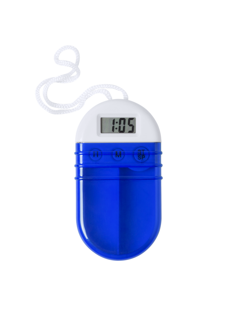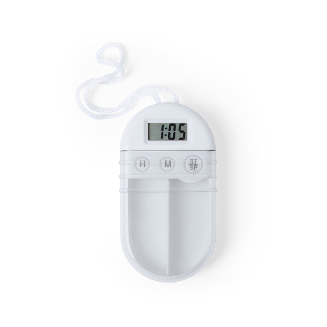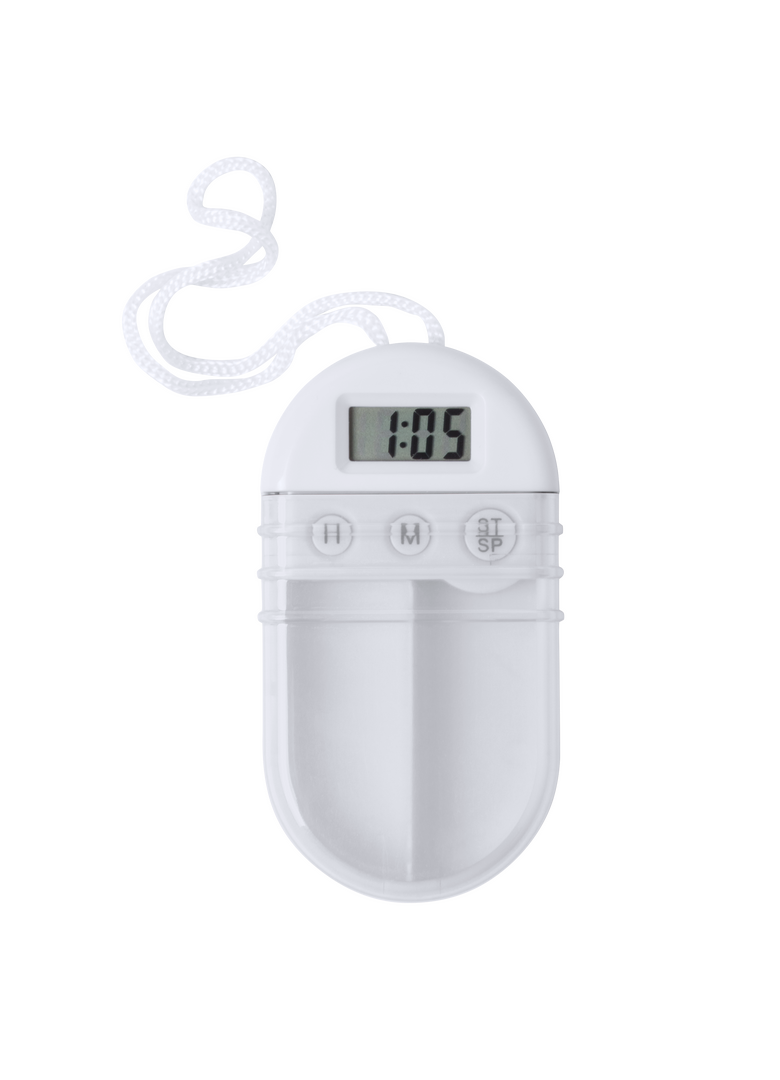 Pastillero con temporizador en suave y resistente material acabado en color blanco, con tapadera transparente en vivos colores. Dos compartimentos interiores para pastillas y temporizador digital ajustable. Pilas de botón incluidas y presentado en atractiva caja de diseño.
