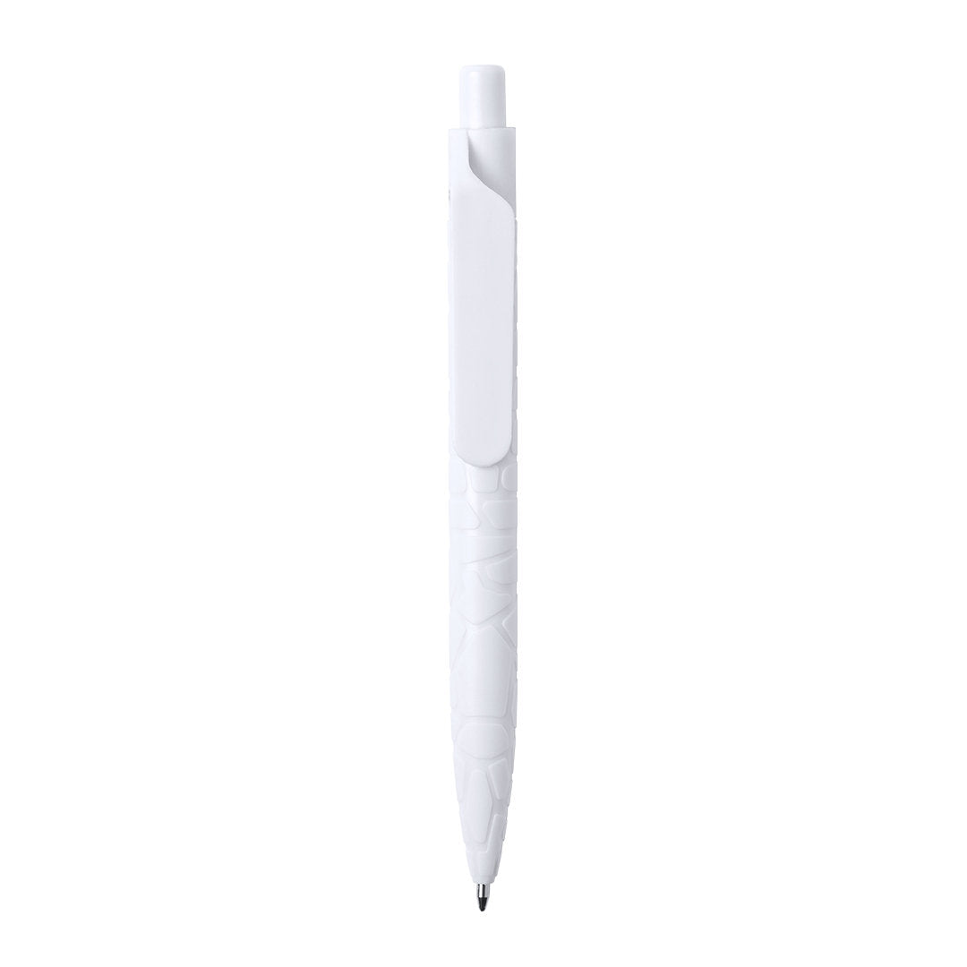 Bolígrafo de línea nature y mecanismo pulsador. Cuerpo troquelado fabricado con extractos de piedra natural, ayudando a la reducción del uso de plásticos, además de proporcionar un acabado suave y resistente. En color blanco y con distintivo natural stone en la parte superior, de cartucho jumbo y en tinta azul.