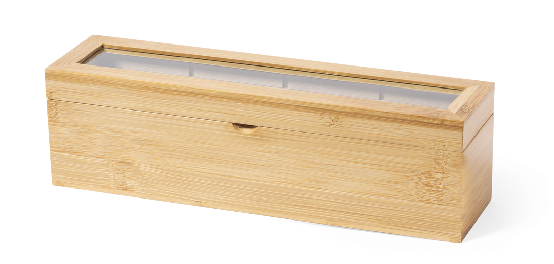 Caja para té de línea nature, fabricada en bambú, con cristal en tapa. Incluye 4 compartimentos para almacenar distintos tipos de té. Presentada en atractiva caja de diseño eco.