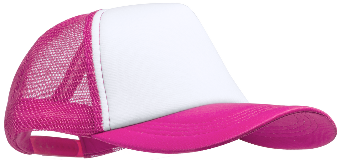 Gorra tipo trucker de 5 paneles en material 100% poliéster de suave acabado. En variada gama de vivos colores, con panel frontal en color blanco y cierre ajustable de plástico.